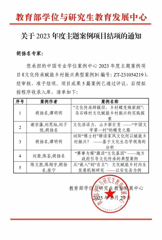 近日,以湖南师范大学中国乡村振兴研究院胡扬名教授为首席专家的2023年度中国专业学位案例中心主题案例项目《文化传承赋能乡村振兴典型案例》(编号:ZT-231054219)顺利通过结项验收,项目提交的五个案例成果全部通过专家评议,拟按程序收录至中国专业学位中心案例库,供各大高校在相关专业学位教学中使用,进一步推动案例教学与实践融合,服务国家乡村振兴战略需求。