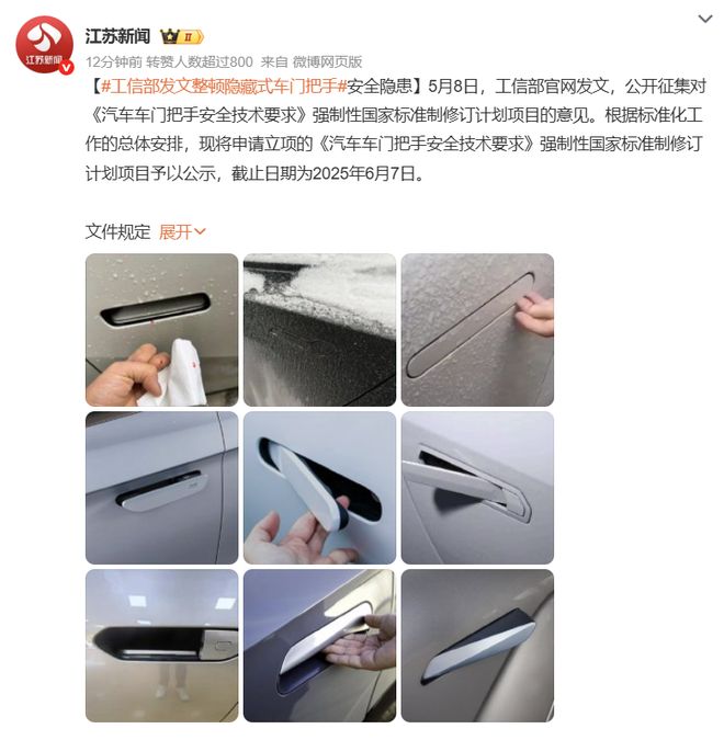 工业和信息化部公开征集对《汽车车门把手安全技术要求》强制性国家标准制修订计划项目的意见,截止日期为2025年6月7日。