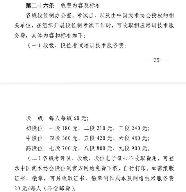 具体标准为:段级每人每级60元;初段位一至三段分别为180元、210元、240元;中段位四至六段分别为360元、420元、480元;高段位七至九段分别为700元、800元、900元。各级考评员、段级、段位电子证书不收取费用,可登录中国武术协会段位制官方网站免费下载打印。如需纸版证书、徽章,另收取20元/人的制作成本及网络技术服务费(不含邮费)。