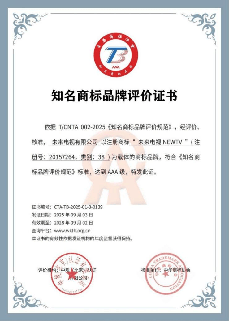 2025年9月5日至9月8日,由中华商标协会主办的“第十五届中国国际商标品牌节”在山西太原举行。通过参评组织申请、第三方机构专业评价、中华商标协会知名商标品牌工作委员会专家评审等诸多环节,未来电视有限公司获评最高等级“AAA级知名商标品牌”认证,并在商标品牌节活动期间正式获得授牌。作为互联网电视领域首家获此殊荣的机构,这标志着未来电视在品牌建设、知识产权保护和技术创新方面达到了行业领先水平。